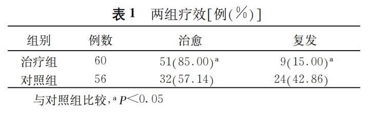 治療組治愈率85%?明顯高于對照組的54?14%( P<0?05)?并且不良反應輕微。