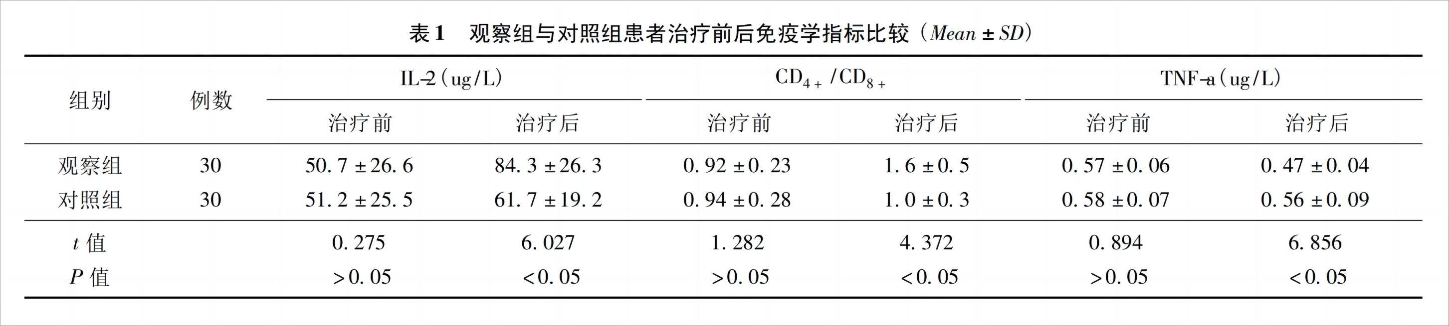 治療前兩組患者IL-2、CD4+/CD8+、TNF-a差異無統(tǒng)計學意義(P>0.05);