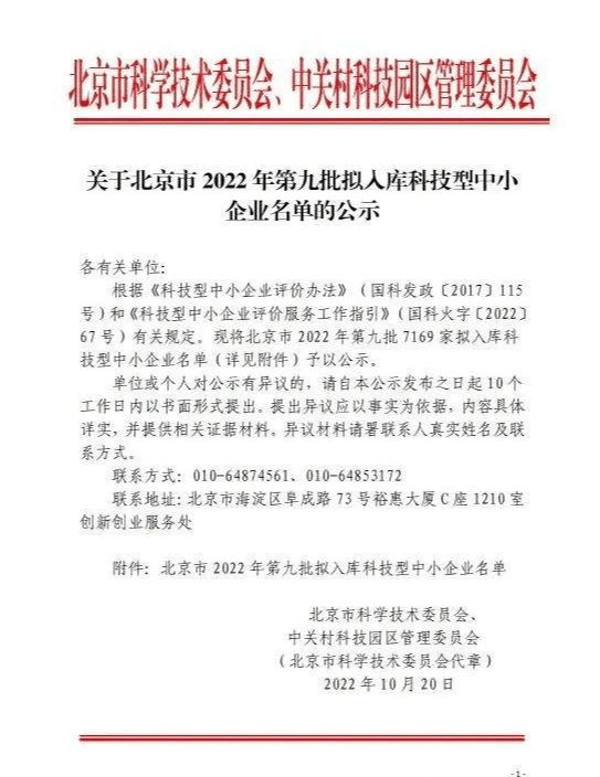 2022年10月,經(jīng)北京市科學(xué)技術(shù)委員會(huì)、中關(guān)村科技園區(qū)管理委員會(huì)組織各區(qū)評價(jià)工作機(jī)構(gòu),根據(jù)《科技型中小企業(yè)評價(jià)辦法》(國科發(fā)政〔2017〕115 號)和《科技型中小企業(yè)評價(jià)服務(wù)工作指引》(國科火字〔2022〕67號)有關(guān)規(guī)定,評定北京派特博恩生物技術(shù)開發(fā)有限公司入庫北京市2022年第九批科技型中小企業(yè)。